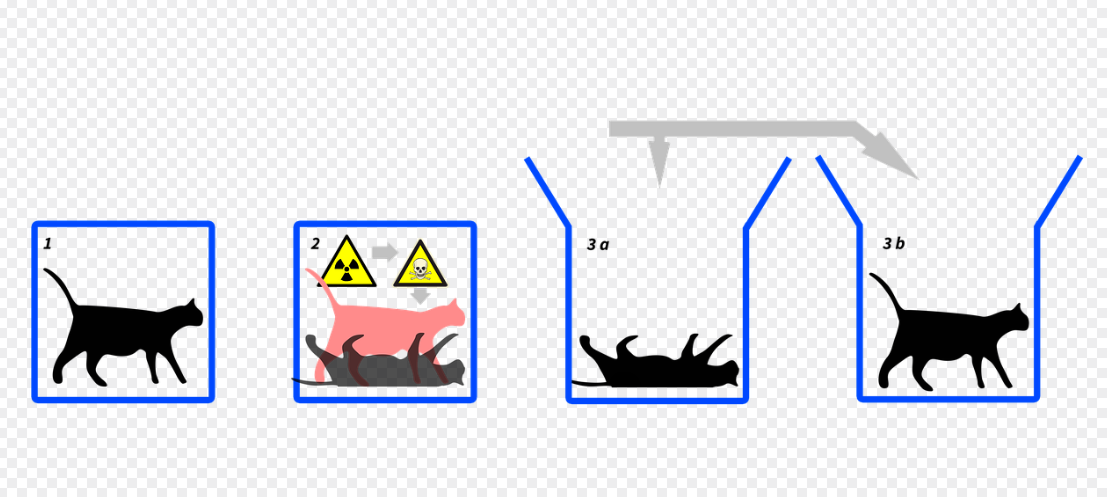 양자역학에 따르면 관측하지 않은 핵은 '붕괴한 핵'과 '붕괴하지 않은 핵'의 중첩으로 설명된다. 한 시간 후 상자를 열었을 때 관측자가 볼 수 있는 것은 "붕괴한 핵과 죽은 고양이" 또는 "붕괴하지 않은 핵과 죽지 않은 고양이"뿐이다.